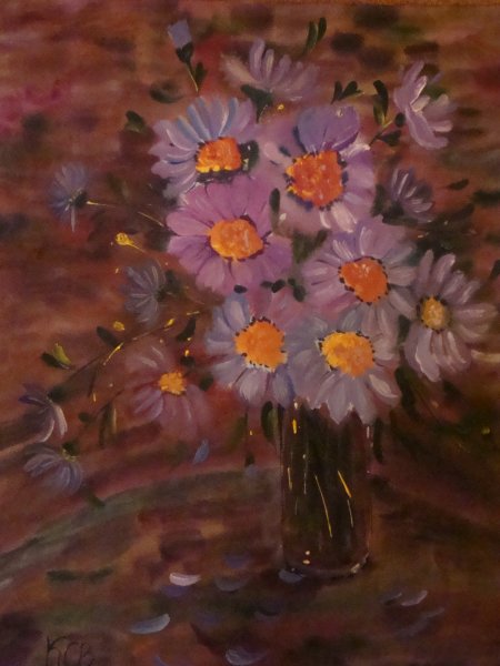 Похоже, что это маргаритки. Сиреневые лепестки, яркие серединки цветка. Впечатляет !