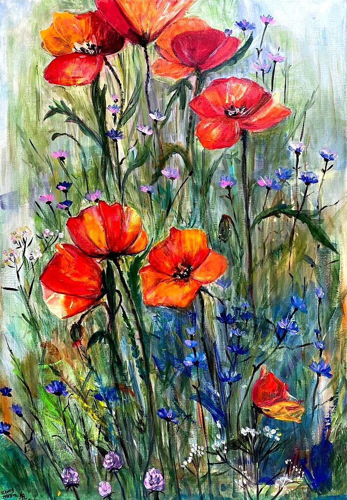 На полотне изображён осенний луг, ещё полный жизни и ярких красок. Огненно-красные и оранжевые маки словно вобрали в себя тепло уходящего солнца, их лепестки напоминают языки пламени, что не желают угаснуть. Вокруг них рассыпаны васильки и другие полевые цветы, но их холодная сине-фиолетовая гамма уже предвещает скорое увядание природы.