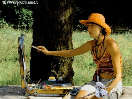 Отличный снимок!Великолепно позирует сама художница!Рабочий момент создание шедевра!